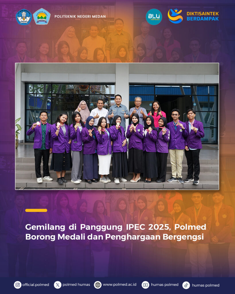 Mahasiswa Politeknik Negeri Medan (Polmed) kembali menorehkan prestasi gemilang di kancah nasional. Dalam ajang Indonesian Polytechnic English Championship (IPEC) 2 Tahun 2025, Polmed berhasil mengharumkan nama kampus dengan memborong sejumlah medali di berbagai kategori.