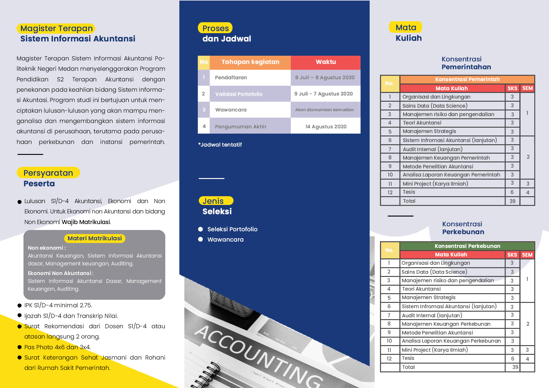 Magister Terapan Sistem Informasi Akuntansi Politeknik Negeri Medan menyelenggarakan Program Pendidikan S2 Terapan Akuntansi dengan penekanan pada keahlian bidang Sistem Informasi Akuntasi. Program studi ini bertujuan untuk menciptakan lulusan-lulusan yang akan mampu menganalisa dan mengembangkan sistem informasi akuntansi di perusahaan, terutama pada perusahaan perkebunan dan instansi pemerintah.