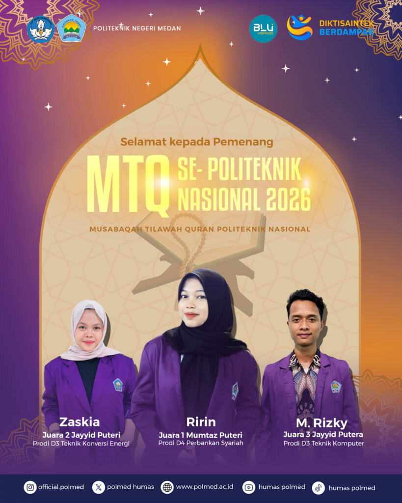 Mahasiswa Politeknik Negeri Medan (Polmed) kembali menorehkan prestasi membanggakan pada ajang Musabaqah Tilawatil Qur’an Mahasiswa Nasional Politeknik 2026 (MTQPN 2026) yang diselenggarakan oleh Politeknik Negeri Tanah Laut.