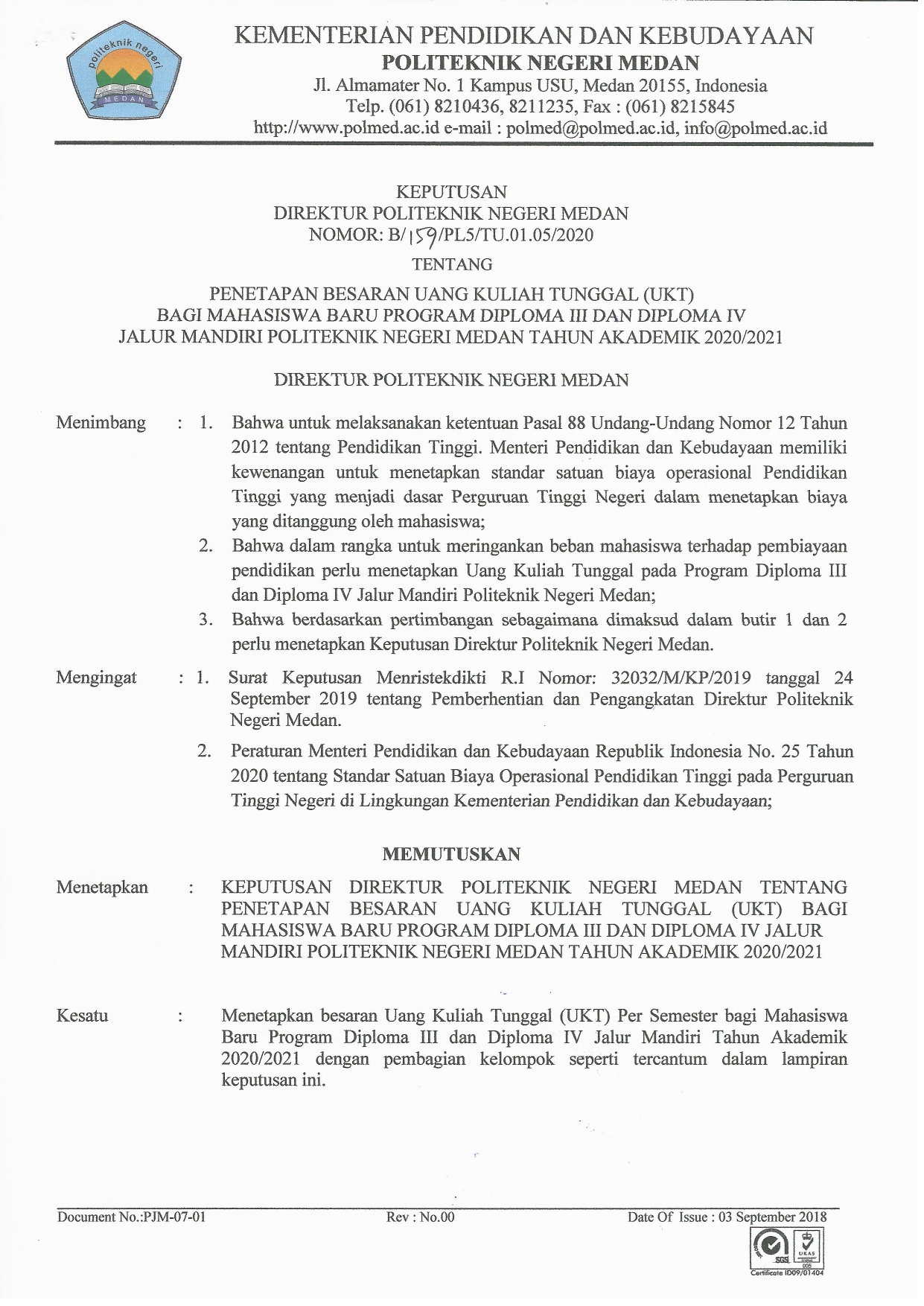 Pengumuman Besaran UKT, Tata Cara Registrasi, dan Pembayaran Calon Mahasiswa Baru Jalur Mandiri Politeknik Negeri Medan T. A 2020 & 2021