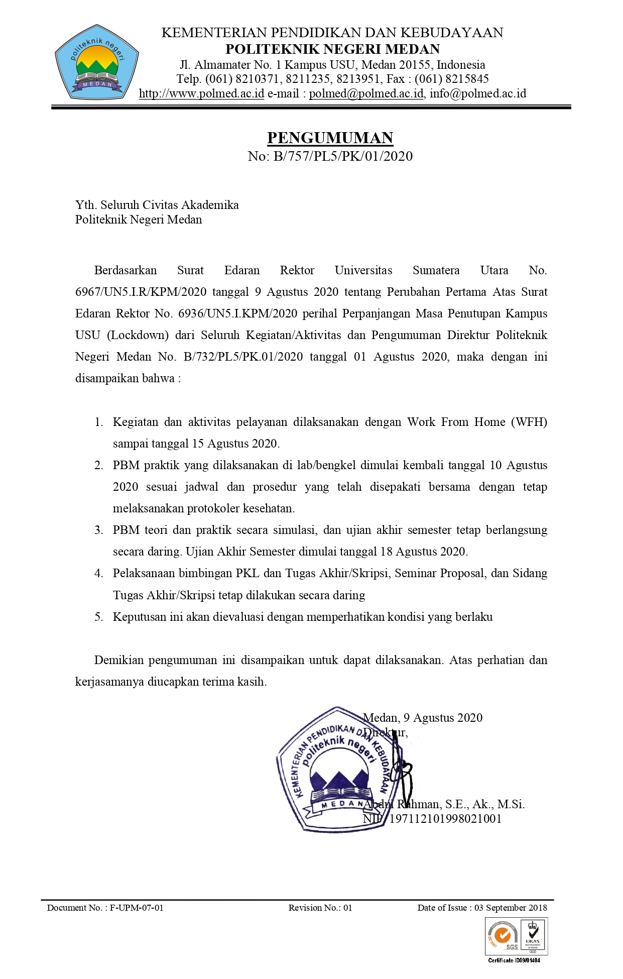 Perpanjangan Masa Penutupan Kampus Politeknik Negeri Medan Guna Pencegahan Penyebaran Covid-19