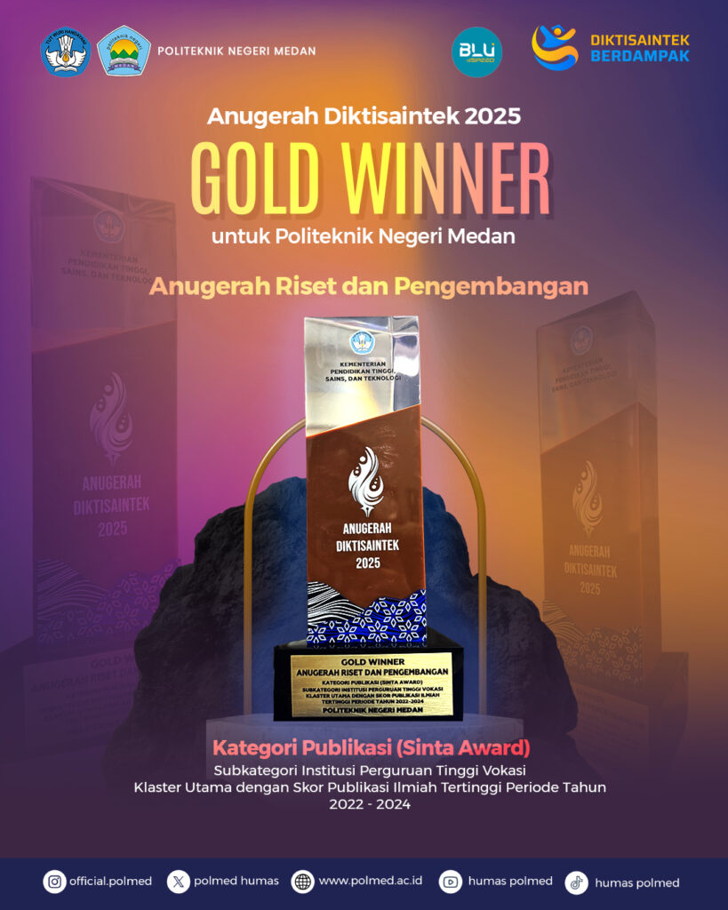 Politeknik Negeri Medan (Polmed) kembali menorehkan prestasi membanggakan di tingkat nasional dengan meraih Gold Winner pada Anugerah Diktisaintek 2025. Penghargaan ini diserahkan dalam acara yang berlangsung di Graha Diktisaintek, Senayan, Jakarta (19/12).